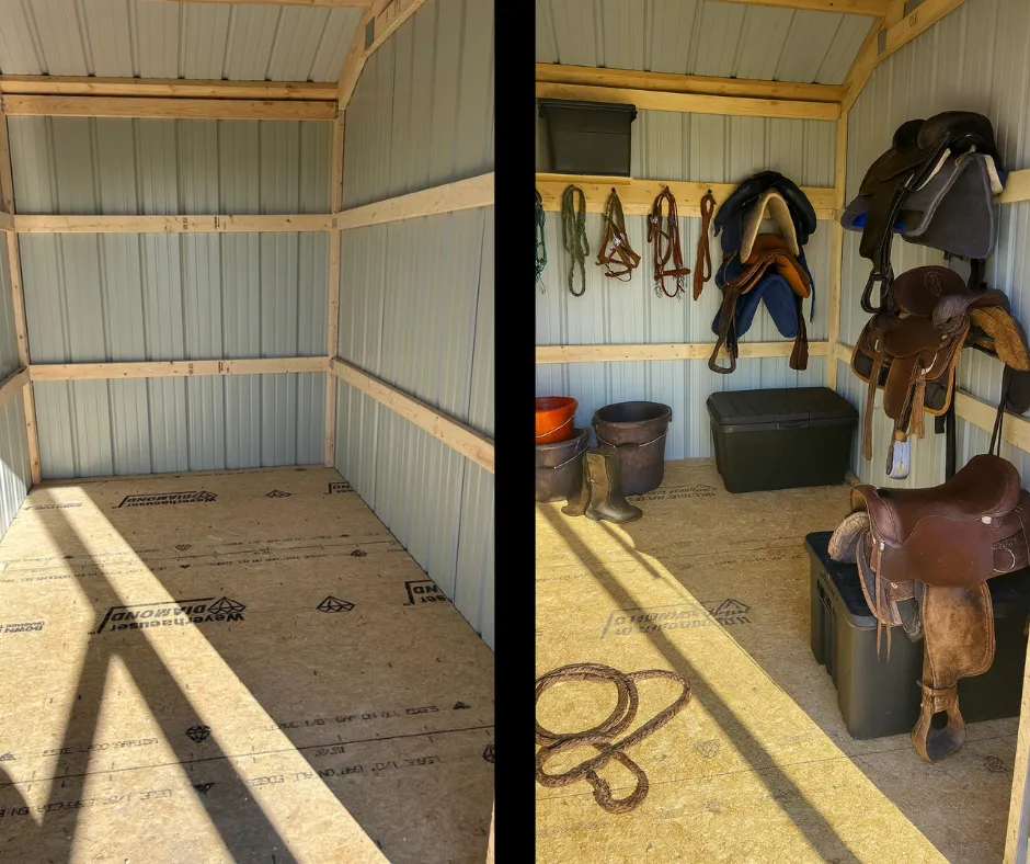 A 10×36 Horse Shed featuring a 6 ft tack room for storage. 3 stalls with plenty of room for animals comfort and Dutch doors