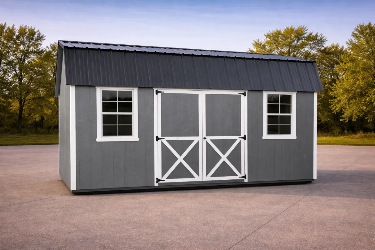 A 10x20 Classic Highbarn with a traditional barn-style roof for extra overhead storage. Features durable siding and wide double doors for easy access and maximum space.